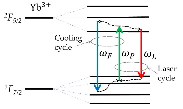 Figure 2. Energy diagram of an Yb3+-doped radiation-balanced laser. ωP and ωL are the pump and laser frequencies, respectively. ωF is the mean fluorescence frequency.