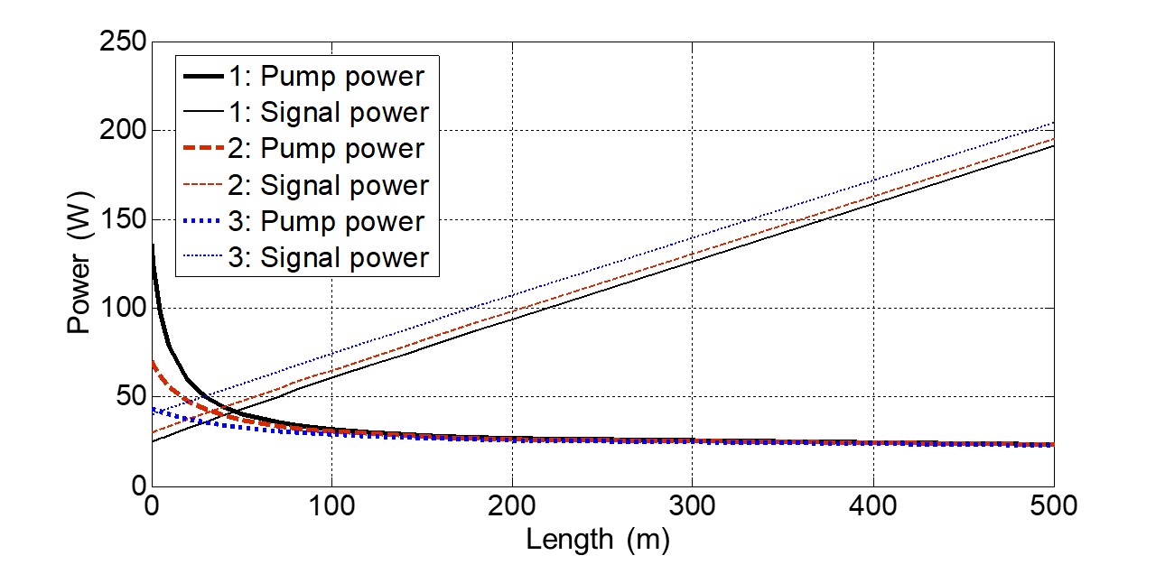 As one can see from the theory, a detailed balance of the stimulated and spontaneous emission at each point of the laser medium can provide a solid-state laser that generates no internal heat. Unfortunately, there are two serious problems associated with the practical development of radiation-balanced amplifiers and lasers: the precise control of the pump power and almost linear growth of the amplified signal (Figure 3). The linear growth of the power of the amplified signal requires an enormous increase in the length of the active medium for very high output power. The athermal bulk or fibre laser requires precision control of the pump power at each point along the length laser medium. This is not a simple problem, especially in the case of a fibre amplifier or laser.