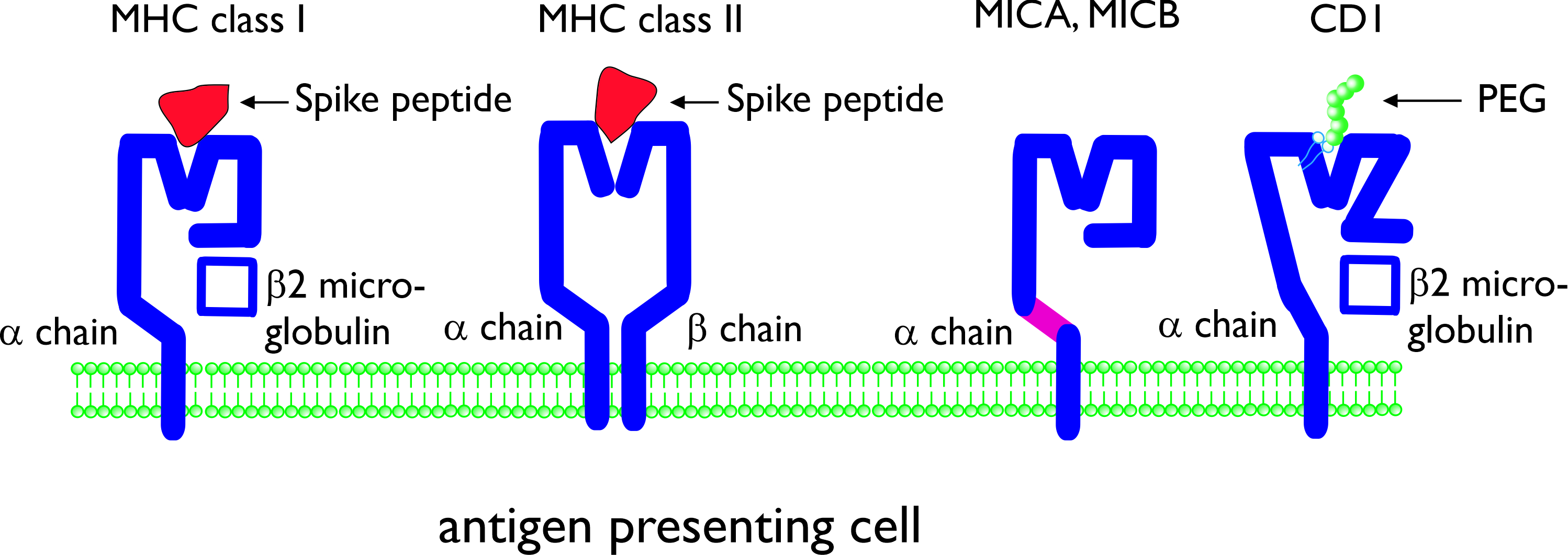 Figure 1. Schematic presentation of conventional and non-conventional antigen-presenting molecules major histocompatibility complex (MHC) class I and class II. The molecules are shown with (different) Spike peptides in the antigen-presenting groove. MHC class I-related molecules A and B (MICA, MICB) and CD1 are non-conventional antigen-presenting molecules consisting of a single α chain. CD1 is composed of an α chain, associated with β2 microglobulin. CD1 can present lipid antigens and (potentially) lipid-bound polyethylene glycol (PEG).