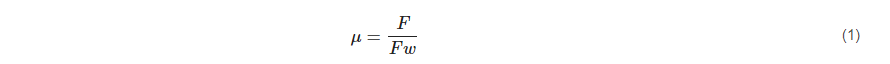 where µ is the non-dimensional friction coefficient, F is the tangential friction force between the tire tread rubber and the horizontal traveled surface and Fw is the perpendicular force or vertical load.