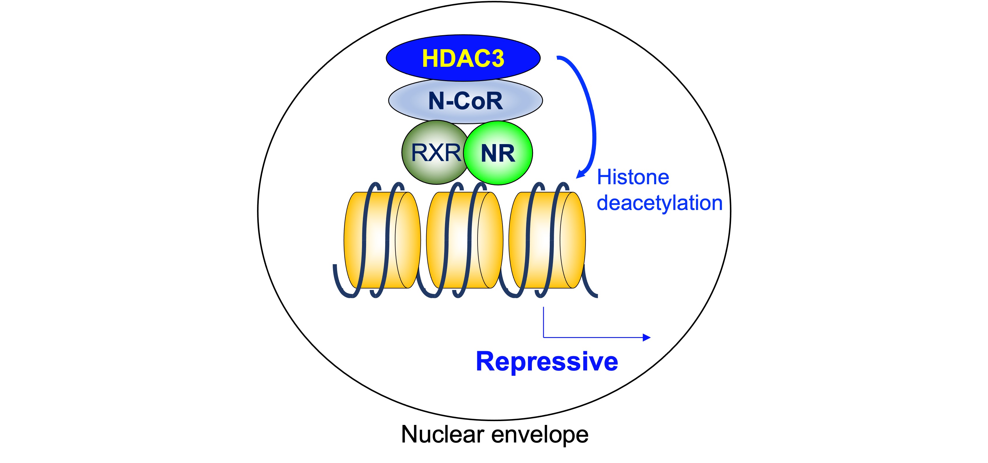 Gene expression is suppressed by several orphan NR, whose ligands have not yet been identified. These NRs work as monomers, homodimers, or heterodimers with RXR or other NRs. The typical molecular mechanism is similar to ligand-independent repression, where N-CoR/SMRT-HDAC3 complex plays a pivotal role. The critical involvement of HDAC3 has been extensively studied for an orphan NR, REV-ERBα, which plays a central role in circadian rhythm by repressing core clock genes [35].