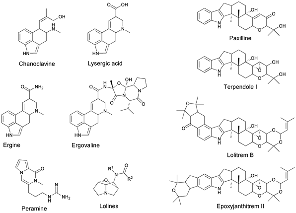 Figure 4. Molecular structures of the known secondary metabolites produced by Epichloë, in planta. Ergot alkaloids include chanoclavine, lysergic acid, ergine, and ergovaline; indole diterpenes include paxilline, terpendole I, lolitrem B, and epoxyjanthitrem II; peramine; and the lolines. (Figure provided courtesy of W. Mace).