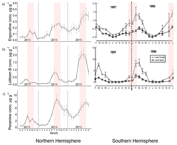 Figure 5. Seasonal trends in expression of ergovaline (a), lolitrem B (b), and peramine (c). Red shaded area represents summer months for the Northern and Southern Hemisphere. Figures modified from Fuchs et al [61] and Watson et al [62].