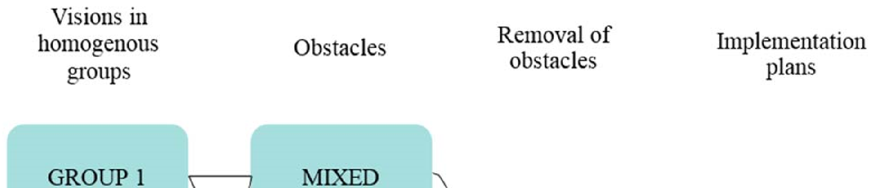 In addition to the potential to increase agency, Criterion 2 encourages the participants to express and combine their individual interests into a future vision in homogenous groups (Figure 2). The dialogues in homogenous groups are highly significant for the whole process, since the visions created by them form the basis of the following dialogues. As professional or occupational boundaries and identities are often seen as constraints to genuine client orientations in the rank order of occupations, the members of these groups use the resources offered by democratic dialogue to express their views.