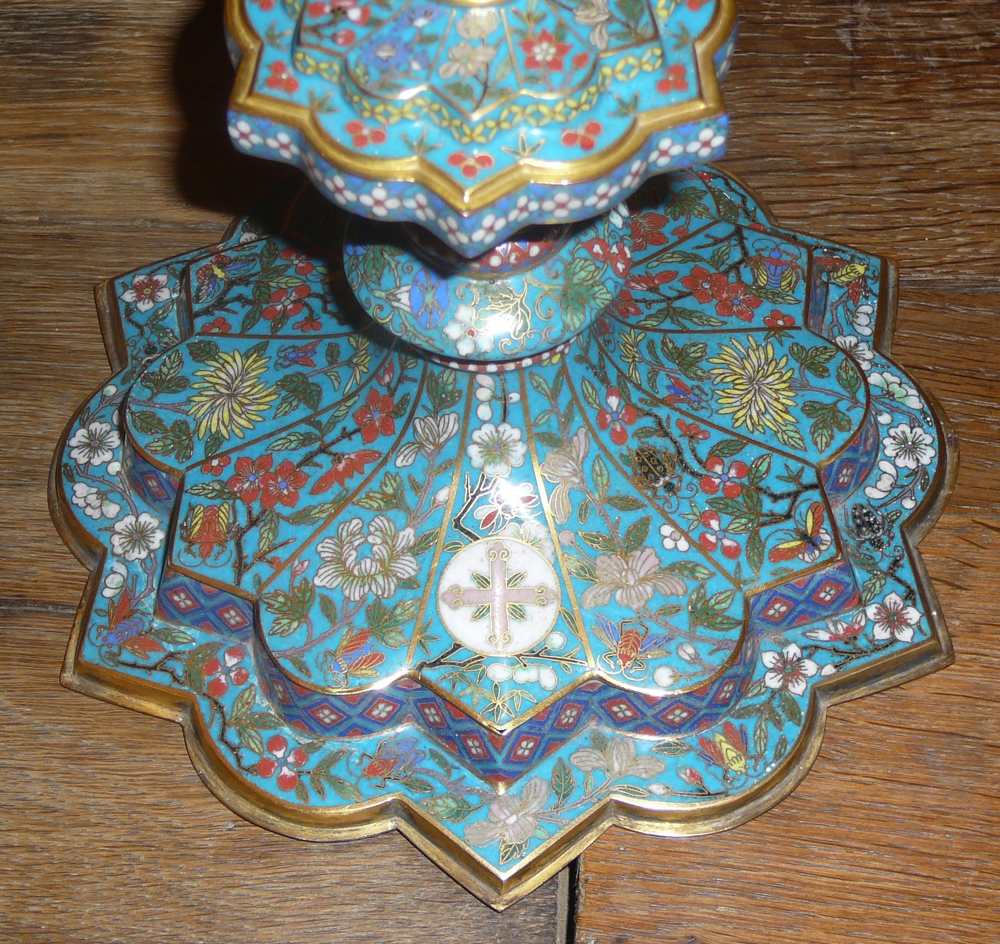 Cloisonné is the technique of creating designs on metal vessels with colored-glass paste placed within enclosures made of copper or bronze wires, which have been bent or hammered into the desired pattern. Known as cloisons (French for “partitions”), the enclosures generally are either pasted or soldered onto the metal body. The first written reference of Cloisonné in China is in Cao Zhao’s Gegu yaolun (格古要論)), or Important discussions about assessing antiques (1388), where it is called “Dashi (‘Muslim’) ware”. However, the oldest known pieces in China correspond to the Yuan dynasty (1271–1368). Similarly, in Cao Zhao’s book, cloisonné was associated with the trousseau of elite ladies, but was not yet considered appropriate for the art collection of refined literati. In Chinese cloisonné, blue is the predominant color, and the Chinese name for the technique is jingtailan (“blue Jingtai objects”) referring to Emperor Jingtai (r. 1449–1457), in whose times the production of these objects flourished. By the late Ming Dynasty, cloisonné passed from the trousseau of the Chinese elite ladies and Buddhist temples to the collections of the literati as an exquisite object to integrate into the Chinese artistic tradition. What is more, it was even part of sets of offerings in Confucian mausoleums and in the halls of representation of power in the Forbidden City. To achieve the definitive implantation of Christianity in China, since the 17th century the Jesuit missionaries used the adaptationist method in their preaching and artistic practices to be able to empathize with Chinese audiences. Thus, they used Western models, but adaptingadapted to the visual language and the ornamental and symbolic motifs of the Chinese artistic tradition. In any case, the Jesuits aimed to convert the elites first. To do this, they used artistic and literary means already established in the Chinese culture of the literati, such as cloisonné precious objects and Chinese inscriptions. Thus, these objects of art are not only situated within a dialogue between the West and the East but also within the stratification of the Chinese society that the Jesuits took into consideration.