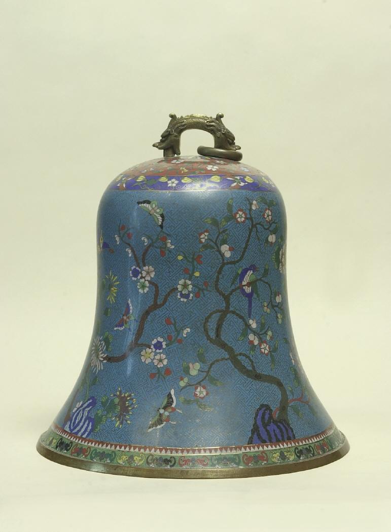 Made of copper and cloisonné, with dimensions of 36.5 x 35.7 cm, in its upper part it presents a rounded shape in which a golden two-headed dragon hanger is inserted, the fifth symbol of the Chinese zodiac and related to the emperor. This solar symbol, which expresses Yang energy, that is, virile power and strength, applied to a Christian element could refer to Christ as the center from which power and glory emanate. The skirt with a turquoise blue background, partitioned with a geometric grid, presents plum (winter), peony (spring) and chrysanthemum (autumn) flowers, with birds on the branches and butterflies in flight (蝴蝶 hú dié). This type of motif dates back to the Song dynasty (960–1279), to the paintings of traditional naturalistic landscapes of mountains, flowers, fruits and birds. Closely linked to Taoism, these floral representations pursued the integration of nature and man, and the experience of their vital rhythms. The references to the seasons in the decoration of the bell complete the iconographic program of the Chaflán Hall of the Cerralbo Museum, which was once a private home. This room, intended for gatherings and rest after dancing, also presents a pictorial mural decoration based on the cycle of the seasons of the year, with elements that refer to the process of cultivating the land. The bell also has a border with bats on a green background on the lower edge, on which there is another, narrower, of red and white triangles, motifs introduced at the end of the Qing dynasty as a symbol of good omen for the owner of the object. In Chinese, the word bat and happiness are homophones (fu), so this type of representation would be very common during this time, which coincides with the reign of Emperor Qianlong (1735–1796). In the upper area, a radial pattern of chrysanthemum surrounded by other flowers, stems and floral border with butterflies frames the ensemble, also similar to another enamel bell with bronze dragon fittings preserved in the Museo Nacional de Artes Decorativas in Madrid (Accession number DE10240).