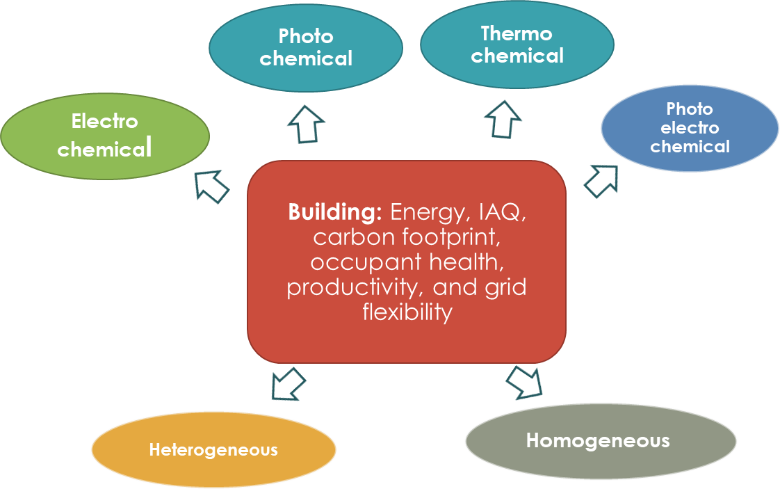In the field of indoor air quality and emissions, there is an absolute need for highly active, non-PGM catalytic materials which are tolerant to poisoning species. Incorporation of these materials into reactor structures offering negligible pressure drop with high capacity (lifetime enhancement) and ability to integrate in existing building stock is a critical requirement. Catalytic materials capable of addressing multiple reactions with high selectivity would be ideally suited for building air quality improvements. Such catalysts must be capable of suppressing CH4, CO, NOx, formaldehyde emissions from the flue gas generated from gas fired heating, and cooking equipment as well as from prime movers in cogeneration systems. Photocatalyst based solutions could play a vital role in successful implementation of such solutions. Buildings offer a variety of surfaces where such systems can be incorporated, for instance, selective surfaces within the building envelope. Hybrid materials with adsorbents and catalysts are necessary for improved conversion and selectivity.