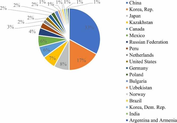 Almost 33% of global cadmium production is concentrated in China, as shown in Figure 2.