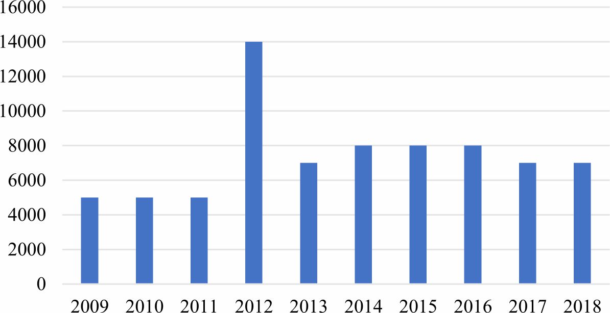 Figure 5. Input fractions of Ni-Cd batteries in recycling in the EU, 2009–2018 (tons). Modified from [6].