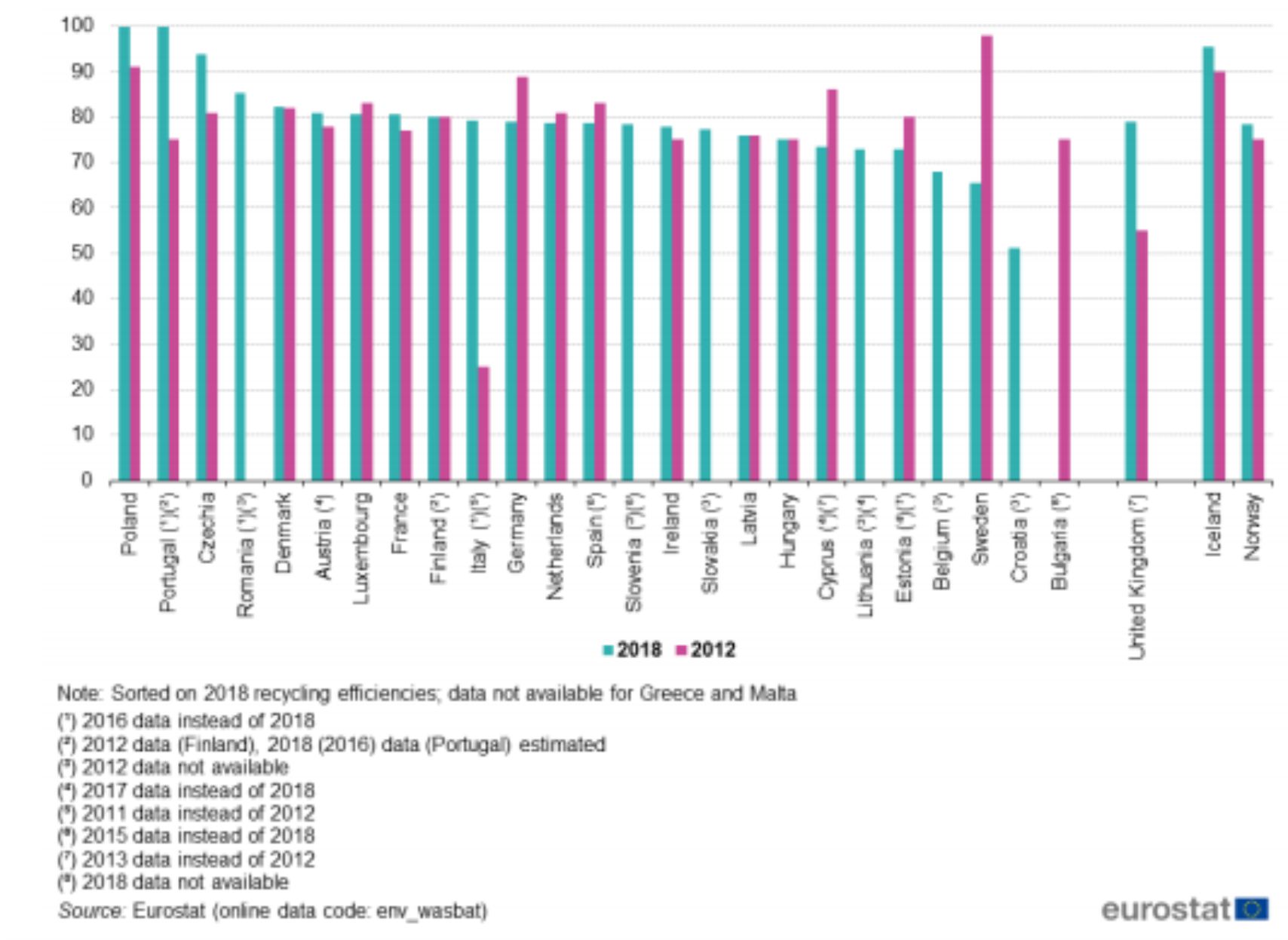 Figure 6. Recycling efficiencies for Ni-Cd batteries, 2012 and 2018 [6]. (1) 2016 data instead of 2018, (2) 2012 data (Finland), 2018 (2016) data (Portugal) estimated, (3) 2012 data not available, (4) 2017 data instead of 2018, (5) 2011 data instead of 2012, (6) 2015 data instead of 2018, (7) 2013 data instead of 2012, (8) 2018 data not available.