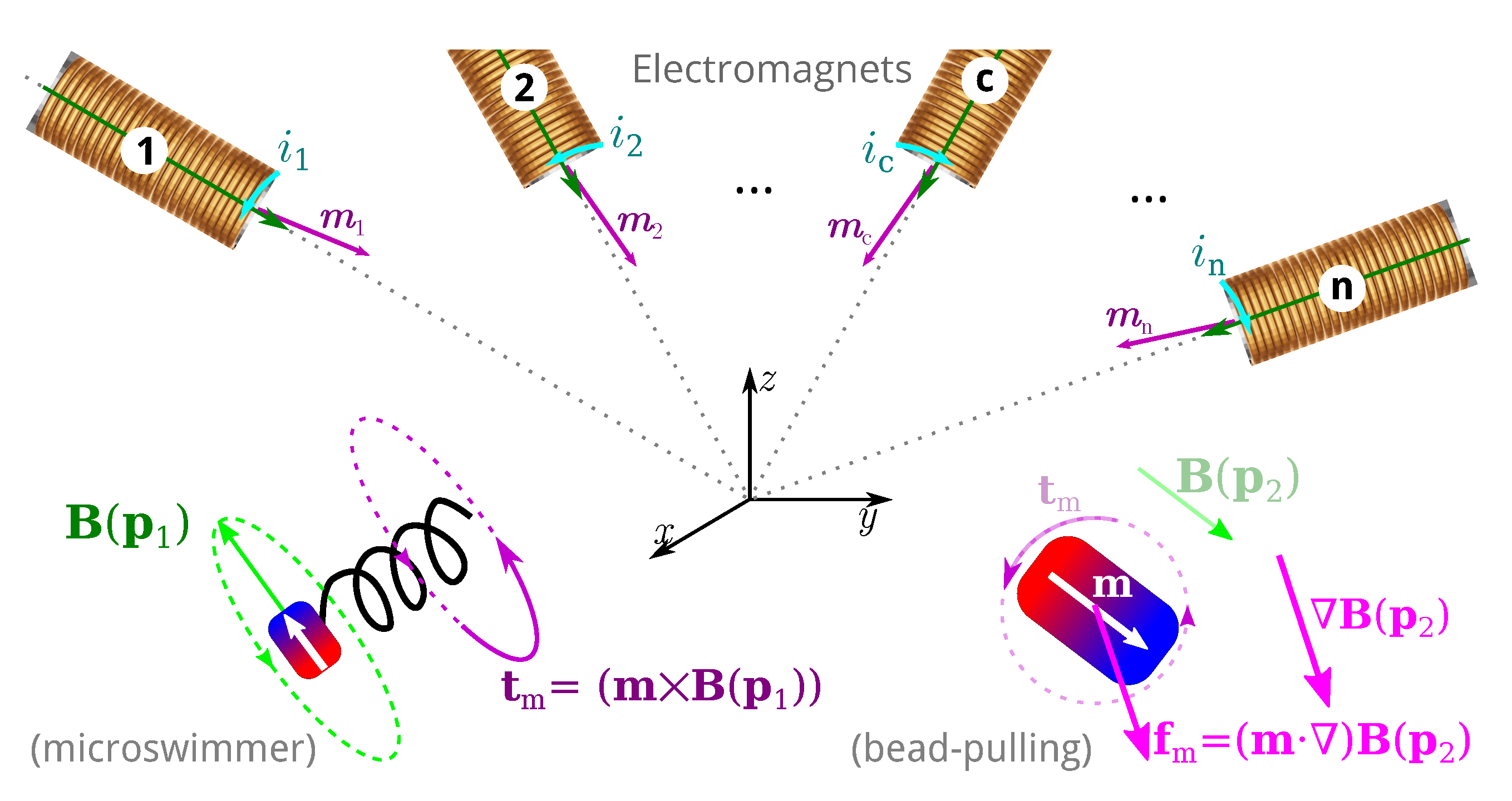 EMA systems consisting of several electromagnets allow generating a magnetic field and/or a gradient field in a given workspace, as shown in Figure 2. These fields induce a magnetic torque and a force on the magnetized materials of the untethered microrobots. The expression of the magnetic field generated by an electromagnetic coil is derived from a single wire and the magnetic dipole. The magnetic field from any electromagnetic coil c can be approximated as a magnetic dipole characterized by its magnetic moment mc, and the point-dipole model is proposed. It can be shown that the magnetic field and its gradient are proportional to the electric current ic flowing through the coil c. The overall magnetic field generated by the n-coils is the superposition of each field. The magnetic field and its gradient are then expressed as: