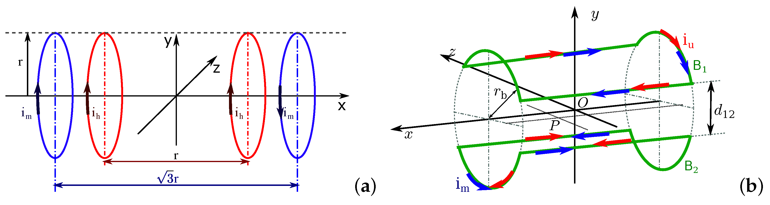 As shown in Figure 6a, the Helmholtz set includes two solenoids with same radius rh separated by the distance: l=rh, and the Maxwell coil consists of a pair of same coils of radius rm separated with a distance l=3–√rm. The currents flowing in an Helmholtz coil pair have same intensity and phase, that is: ih=ihleft=ihright, while the currents of Maxwell coils are flowing in opposite phases, that is: imleft=−imright and im=|imleft|=|imright∣∣. It is clear that the magnetic fields generated by the combination of a Helmholtz coils pair and a Maxwell coils pair are different from that produced by two Helmholtz coils pairs. Hence, the different configurations of platforms composed of different coils pairs will be investigated. To make it easier to name each magnetic platform, the researchers introduce the abbreviation to identify them with the nomenclature provided in Table 1.