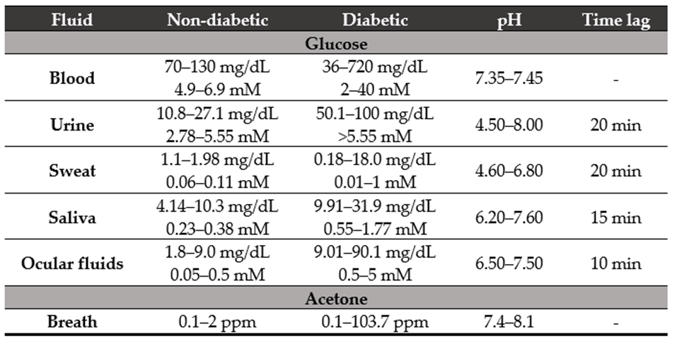 Table 1. Acetone [32] and glucose concentrations (mg/dL [33] and mM [32] units) in diverse rele-vant physiological fluids from patients with or without diabetes. The pH of the fluid [32] and the time required to diffuse blood from the capillaries to the tissues (time lag) [33] are also shown.