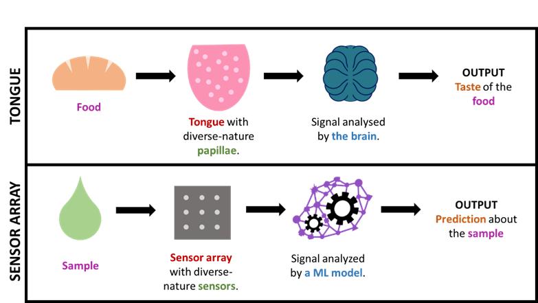 Figure 1. Simplified comparison of the sense of taste and a sensor array + ML technology.
