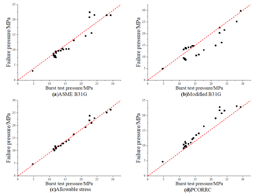 Figure 2. Comparison of burst pressure and predicted failure pressure of low-strength pipelines calculated by different methods. (a) ASME B31G; (b) Modified B31G; (c) Allowable stress; (d) PCORRC.