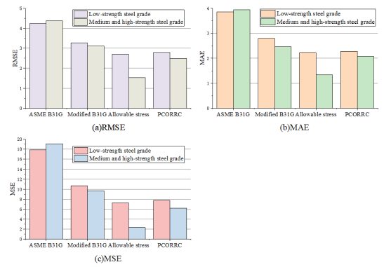 Figure 4. Errors in calculating failure pressure of corroded pipelines of low, medium and high strength steel grades by different methods. (a) RMSE; (b) MAE; (c) MSE.