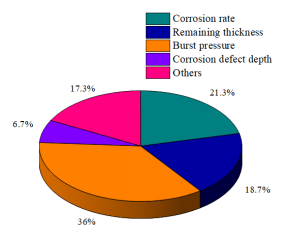 The prediction targets of these models can be roughly divided into the following four categories: burst pressure, remaining thickness, corrosion rate and others. Among them, burst pressure accounts for 36%, remaining thickness accounts for 18.7%, corrosion rate accounts for 21.3%, corrosion defect depth accounts for 6.7% and the others accounts for 17.3%. The proportion of each item is shown in Figure 8. It can be seen from Figure 8 that the model with burst pressure as the output value is still the most, the rest are similar.