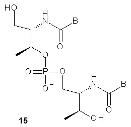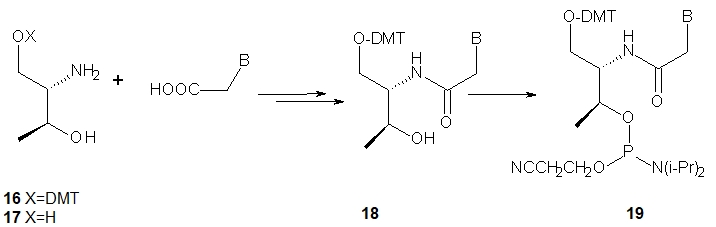 The nucleoside precursors of acyclic threoninol nucleic acid (D-aTNA, 15, a dinucleotide is shown) were prepared using DMT-protected D-threoninol (16, Scheme 2), except for the thymine derivative, for which unprotected D-threoninol 17 was used [28]. The amino groups were used to attach N1-carboxymethyl derivatives of the nucleobases CBz or T, or N9-carboxymethyl derivatives of ABz or GiBu under conditions known from peptide chemistry. The product containing a thymine nucleobase was tritylated and all four DMT-protected nucleosides 18 were routinely phosphitylated to yield the corresponding D-aTNA monomers 19.