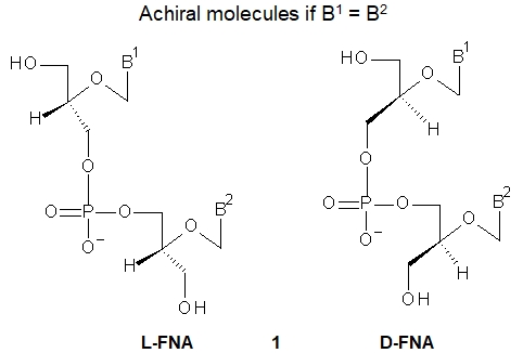 Flexible Nucleic Acids (FNA, 1, shown are dinucleotides) were one of the first proposed acyclic nucleotides for an evolutionary precursor to DNA and RNA, and were the first synthesized acyclic analogs of DNA. While glycerol itself is an achiral molecule, any derivatization at either of the two primary hydroxyl groups leads to a chiral compound producing L-FNA or D-FNA depending on the chiral glycerol derivative used in the synthesis.