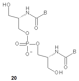 Compared to aTNA, the acyclic flexible scaffold of serinol nucleic acids (20, a dinucleotide is shown) does not contain a methyl group (in the position next to the amino group), which gives rise to the phenomenon of two stereogenic centers in the aTNA unit [37]. Thus, the chirality of the SNA molecule synthesized from four SNA monomers depends only on its sequence. If the sequence is palindromic (e.g., ATTGCGTTA or pATTGCGTTAp), the entire molecule is achiral, although there is a carbon atom with four different substituents in each SNA unit except the central one. When a sequence is non-palindromic (e.g., ATTGCGTAA, pATTGCGTTA or ATTGCGTTAp), the molecule is chiral.
