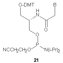 Four chiral SNA-phosphoramidite monomers 21 were synthesized (B=ABz, T, GiBu or CBz) and used for the synthesis of seven SNA-octamers. Their combinations should yield chiral antiparallel, chiral parallel and achiral duplexes. The melting experiments showed that not only were the expected antiparallel SNA homoduplexes formed (Tm = 51 °C), but also the parallel ones, although the latter were much less stable (Tm = 16 °C). Importantly, however, the antiparallel SNA/SNA duplexes were much more stable than the isosequential DNA/DNA (Tm = 23 or 29 °C) or RNA/RNA (Tm = 38 or 39 °C) complexes. Analogously to the previously described L-aTNA/RNA duplex [30] a crystal structure showed that an SNA/RNA duplex adopts right-handed helicity and uses the Watson-Crick base pairing.