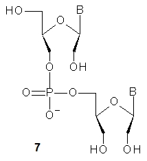 In 1995, Wengel and collaborators described the synthesis of DNA oligonucleotides with 1–3 acyclic unlocked thymidine nucleotides (7, B = Thy, a dinucleotide is shown), that have an OH group at the 2’ position, yet lack a covalent bond between the 2’ and 3’ carbon atoms [6].The unlocked nucleoside was obtained in 88% yield and was converted into the phosphoramidite monomer in good yield. In 2009, the synthesis of other UNA-nucleosides  was published and good yields were reported (B = ABz: 73%, CAc: 64%, GiBu: 63%, U: 79%) [7]. The synthetic route to UNA was further improved by the synthesis of 2’-O-TBDMS monomers [8]. These monomers were used in the automated solid phase synthesis of chimeric DNA-UNA and RNA-UNA oligomers. Further studies showed that the UNA units confer them remarkably high stability in serum [7][9].