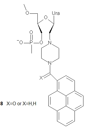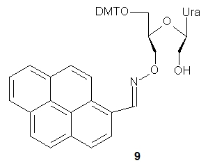 UNA 3’-O-amino-pyrene)-U (9) was used to preparation of oligomers containing this fluorescent pyrene probe. Thermal dissociation studies showed that the presence of 9 in DNA or 2’-OMe RNA oligomers (21-nt long) resulted in increased thermal stability of duplexes with a DNA complement. Fluorescence spectroscopy studies indicated that the pyrenes were located in the minor grooves of the duplexes, and these results were confirmed by molecular modeling, CD, and UV/Vis absorption experiments. Pyrene–pyrene excimer signals were observed for oligomers bearing two or three pyrene-labeled units. Upon hybridization with the complementary DNA strand, the excimer signals disappeared, allowing such constructs to be used for fluorescence-based detection of mismatched hybridization.