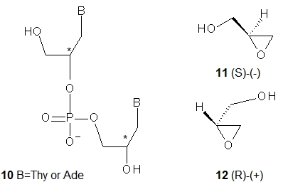 Structurally simple and synthetically relatively easily accessible acyclic glycol nucleic acids (GNA; 10, B = Thy or Ade, a dinucleotide is shown) were obtained by Meggers and coworkers [21]. Note that unlike FNA and UNA, a GNA scaffold contains stereogenic centers (marked with the asterisks in 10) and GNA units can exist in R and S forms. Fortunately, the enantiomerically pure substrates, i.e., (S)-(−)-glycidol (11) and (R)-(+)-glycidol (12), are commercially available. Carefully designed GNAs allowed the study of the formation of anti-parallel and parallel duplexes. It was found that uniformly modified GNA oligomers form highly stable (Tm = 63 °C) anti-parallel helical duplex structures, while the melting curves of the oligomers intended to form a parallel duplex showed no transition. Notably, a single mismatch in the middle of the sequence significantly reduced the stability of the duplex (Tm = 55 °C). It was found that (S)-GNA and its Watson-Crick -paired (R)-GNA counterpart neither hybridize with each other nor form stable duplexes with DNA. However, initial results showed that (S)-GNA 2’-ATTTTAAATATAATAATT-3’ (and not (R)-GNA) associates with RNA (Tm = 35 °C). Analysis of the thermal stability of a GNA/GNA duplex formed by 3’-CACATTATTGTTGTA-2’ with 2’-GTGTAATAACAACAT-3’ revealed a Tm of 71 °C compared to 46 °C for a normal DNA duplex of the same sequence.