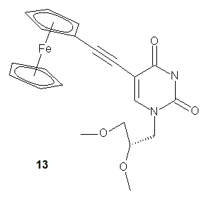 More recently, Kowalski and coworkers published the synthesis of a ferrocenyl-labeled analog of the nucleoside GNA-U (GNA-FcU, 13). The authors suggest a future application of GNA-FcU in the synthesis of redox-active self-assembling “molecular wires”.