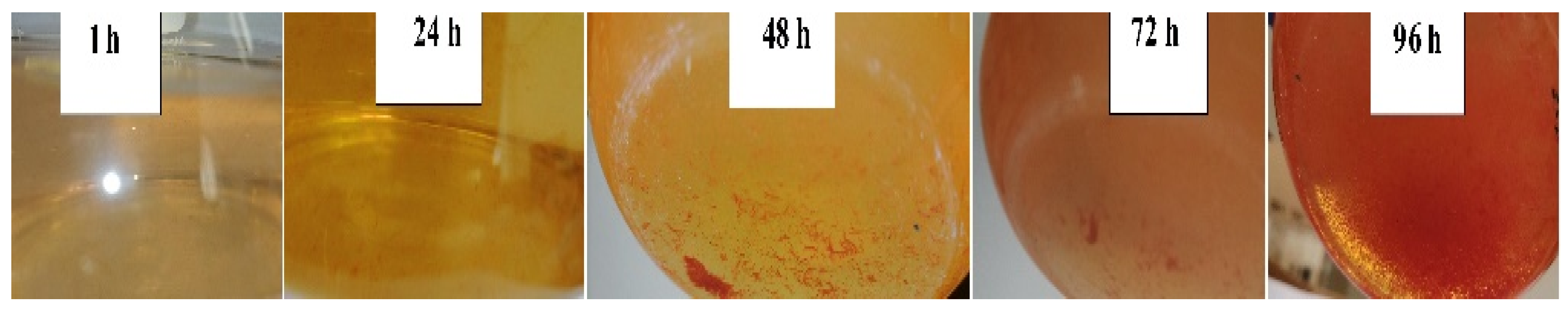 All three selenite concentrations showed a 48 h delay in the formation of visible SeNPs in the cell-free extract.