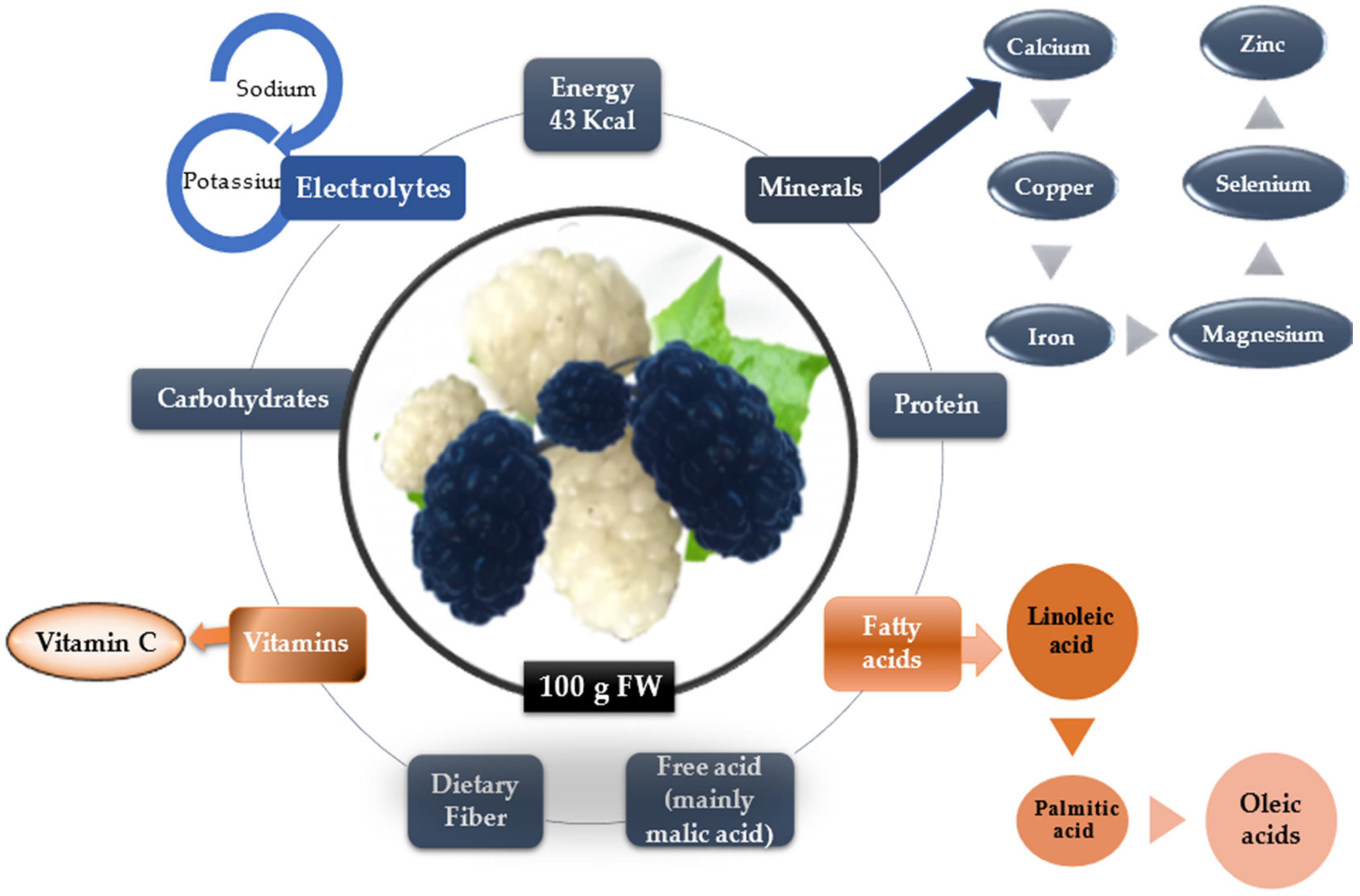 Figura 1 summarizes the nutrients in mulberry fruits with huge importance in human metabolism.