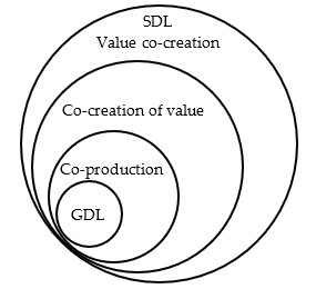 According to Lusch and Vargo (2006), value co-creation has two components: co-creation of value and co-production. The first component is the co-creation of value. This represents the creation and generation of value through the interaction of business actors and the customer and is not the addition of value. The second component is co-production. Lusch and Vargo (2006) showed that under co-production, users collaboratively produce goods with producers, for example, through shared inventiveness, co-design, co-use, or shared production of goods through the value network. They also pointed out that co-creation is superordinate to co-production, although the concepts form a nested structured. Figure 1 presents the encompassing relationship between SDL and goods-dominant logic (GDL) as modified by Taguchi (2010).