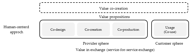 Figure 2 presents the analytical framework illustrating the concepts of value co-creation and the human-centered approach as modified by Groonroos and Voima (2013). Gronroos and Voima (2013) suggested that value creation involves a customer sphere and provider sphere. This study interprets the concept of Gronroos and Voima (2013) and adopts four human-centered approach, namely, co-design, co-creation, co-production, and co-use. In Figure 2, value in exchange is applied as service-for-service exchange for not only B-C, but also B-B. Additionally, this study regards value co-creation as the upper concept relative to human-centered approach.