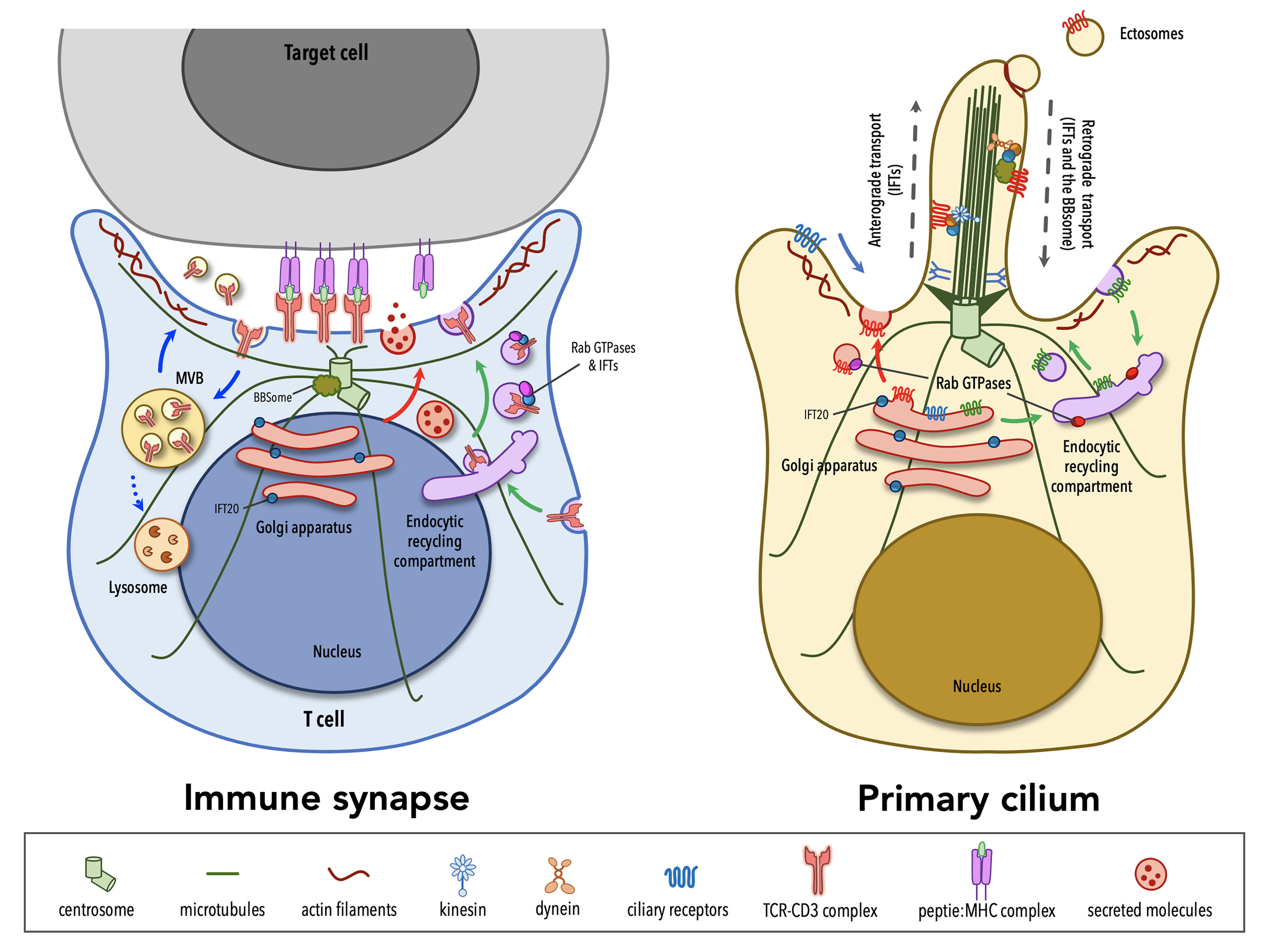Vesicular trafficking, and in particular the trafficking pathway responsible for TCR recycling to the IS, has been extensively investigated in recent years[88]. Surprisingly, some ciliogenesis-related proteins, which belong to the protein families of Rab GTPases together with their guanine nucleotide exchange factors (GEF)[89][90][91][92][93][94][95][96][97] and of soluble NSF attachment protein receptors (SNARE)[98], as well as some adaptor molecules[99][100][101][102] and IFT proteins[103], have now emerged as new players in IS assembly by controlling the synaptic recruitment of the TCR itself and of other receptors and signaling molecules that are known to accumulate at the IS[12][66][97][104][105][106][107][108][109][110][111][112][113] (e.g. the transferrin receptor, the chemokine receptor CXCR4, the transmembrane adaptor LAT, the kinase LCK). Most ciliary proteins specifically implicated in IS assembly have been mapped on the two main arms of the recycling pathway, regulated by such as Rab4 and Rab11, suggesting the existence of different subpopulations of recycling endosomes that, while participating in the canonical recycling pathways orchestrated by Rab4 and Rab11, are responsible for carrying specific cargo destined for the synaptic membrane.