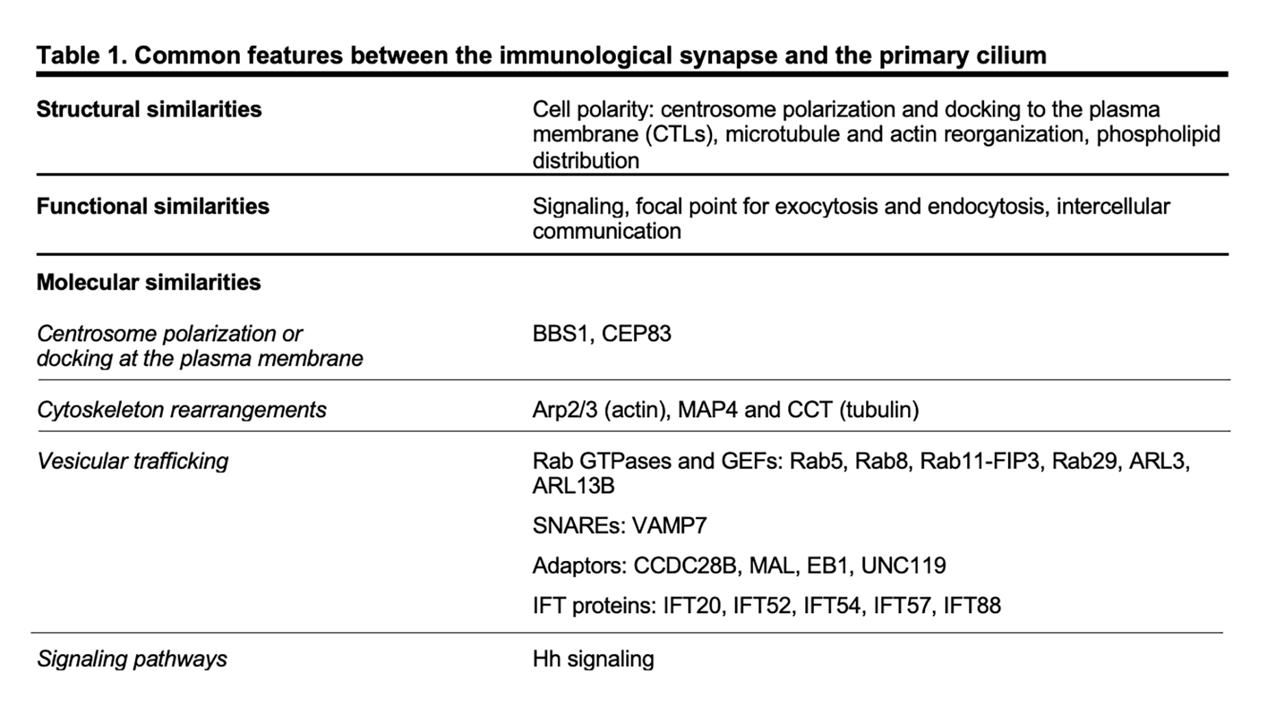 Although lymphocytes are one of the few cell types that lack primary cilia[8][9], electron micrographs of the IS showed that the centrosome docks at the synaptic membrane in CTLs, which is similar to the positioning of the basal body in the primary cilium, suggesting that these cells are able to form a “frustrated cilium” with centrosome docking at the synaptic membrane but not cilium elongation[10][11]. Additionally, T lymphocytes were found to express Intraflagellar Transport (IFT) proteins[12], which are essential for cilium formation and function, and to exploit them for vesicular trafficking and IS assembly. In subsequent years, several structural, functional and molecular parallels have revealed striking similarities between the IS and the primary cilium (Table 1), leading to the hypothesis that these structures might be functional homologues.