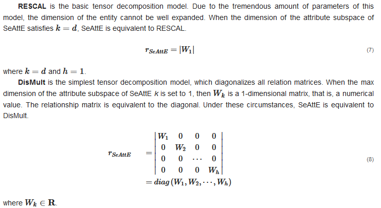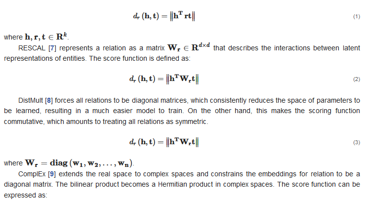 8] constrains all relation embeddings to be diagonal matrices, which reduces the space of parameters to access a more accessible model to train. RESCAL [