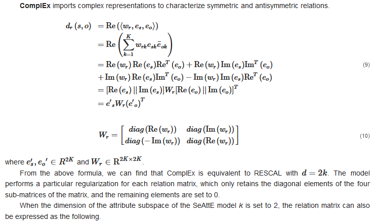8] directly diagonalizes the matrix, which takes the relations as vectors. This operation significantly reduces the number of parameters. There are a large number of complex relation types in the knowledge graphs. However, DisMult is an over-simplified model, which cannot describe complex relations. Then subsequent variants are invented to describe more types of relations, such as asymmetric and hierarchical relations, which are equivalent to designing unique structures for description of specific types of relations. For example, ComplEx [