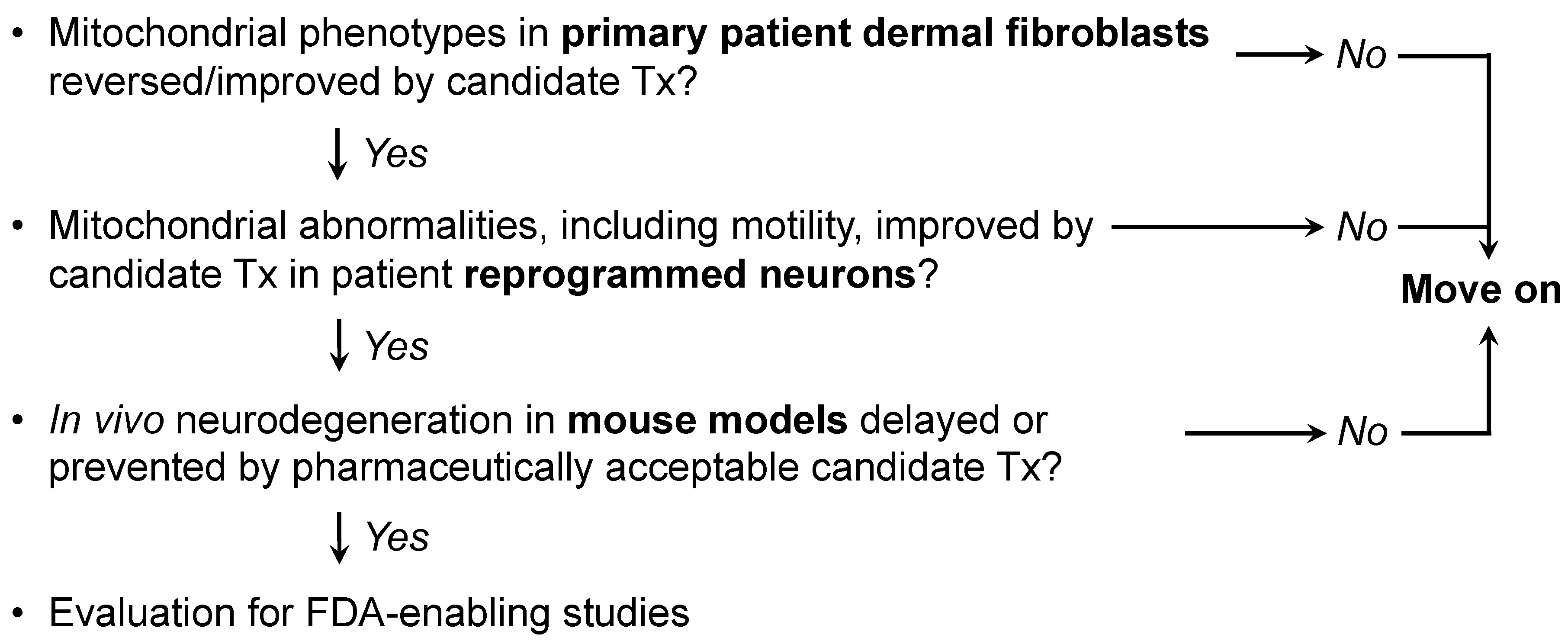Previous and accompanying data demonstrate that cultured human dermal fibroblasts can be induced to exhibit neurodegenerative disease-related mitochondrial fusion-fission phenotypes by forcing mitochondrial metabolism through the simple maneuver of substituting galactose for glucose in the culture medium. Moreover, the same fibroblasts can be directly reprogrammed into neurons that retain hallmark mitochondrial abnormalities, including dysmotility, which is best measured in neuronal axons. Researchers suggest that integration of these platforms with genetic mouse models, as depicted in Figure 2, might be an effective means of evaluating candidate therapeutics in the multitude of genetic neurodegenerative conditions exhibiting characteristic mitochondrial abnormalities, or of different patients for a personalized medicine approach.