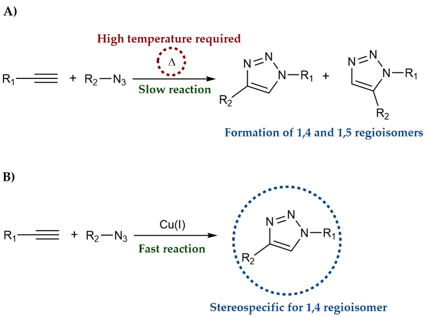 The most common reaction to synthesize the 1,2,3-triazole ring is the Copper (I) catalyzed azide-alkyne cycloaddition (CuAAC). CuAAC, commonly referred to as Click Chemistry, was first introduced by Sharpless and Meldal groups in 2002 and involves the reaction of a terminal alkyne and an aliphatic azide using copper as a catalyst to give 1,4-disubstituted-triazoles [8][9]. Huisgen 1,3-dipolar cycloaddition (Figure 1A) presented several limitations, including long reaction time, high temperature, and the formation of a mixture of 1,4 and 1,5-disubstitution products. In contrast, CuAAC (Figure 1B) allows selective, high-yield, faster and mild reaction conditions, with the formation of few side products[10][11].