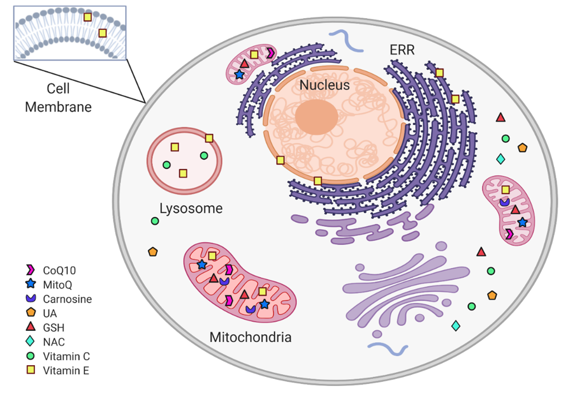 Figure 2. Subcellular non-enzymatic antioxidants targets. Within the cell, non-enzymatic antioxidants are distributed according to their subcellular target. The mitochondria are protected from oxidative stress by CoQ10, MitoQ, carnosine, and Vit C. In the cytoplasm, the antioxidant system includes GSH, NAC, and UA. Vit E is found in cytoplasmic, ERR, and mitochondrial membranes, as well as in lysosomes. (Figure created in BioRender.com)