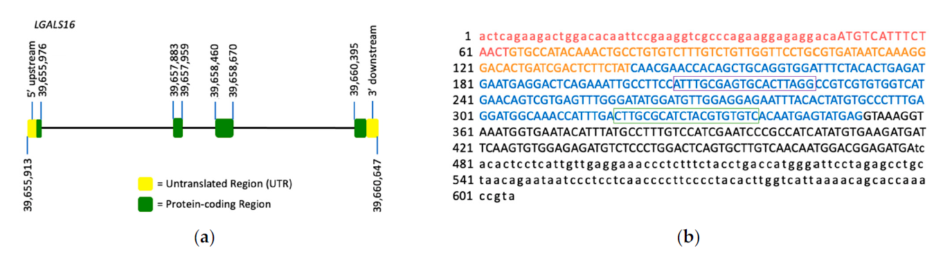 Figure 1. LGALS16 gene structure and the mRNA sequence. (a) LGALS16 (4,735 bp) is located on chromosomal band 19q13.2 and contains 4 exons (ENSG00000249861). (b) NCBI reference sequence of LGASL16 mRNA (NM_001190441.3). Each exon is highlighted with red, orange, blue, and black representing exons 1, 2, 3, and 4, respectively. The protein coding sequence (CDS) is indicated in capitals while UTRs in small characters. The oligonucleotide sequences for PCR amplification are boxed.