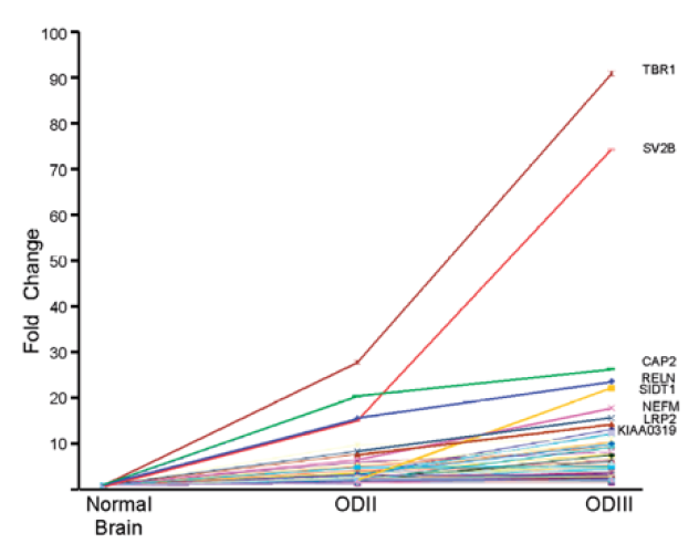 Figure 3. Activation of latent splicing in cancer: Correlation between the level of activation of latent splicing and the severity of OD. The graph depicts fold changes in the level of latent splicing in 125 gene transcripts whose latent splicing expression increased from normal cells to ODII and further increased in ODIII. Names of the top-scoring gene transcripts are indicated [28].