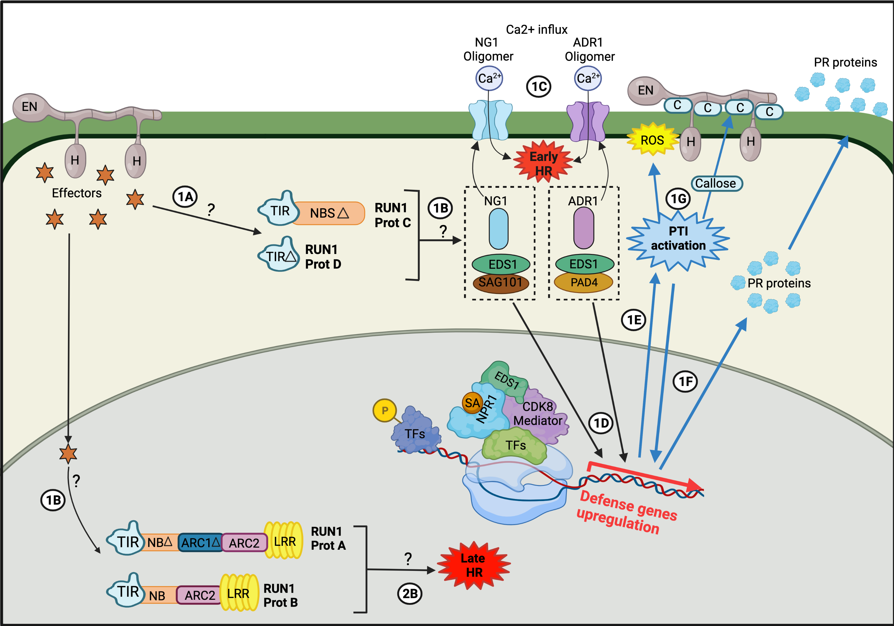 Figure 1. Illustrative figure adapted to summarize the host (V. vinifera) response to fungal (E. necator), showing a theoretical pathway for Run1: MrRUN1 proteins recognize pathogen effectors, which activate PTI. It is proposed that Run1 proteins modulate two response pathways, one generated by truncated proteins (Prot C and Prot D, pathway1) located in the cytoplasm, and another produced by full-length MrRUN1 proteins in the cell nucleus (Prot A and Prot B, pathway 2). Pathway 1: 1A) Truncated Run1 proteins detect fungal effectors in the cytoplasm. 1B) Activation of signaling nodes of PTI: EDS1-PAD4-ADR1 and EDS-SAG10-NGR1. 1C) Activation of Ca2+ influx, which culminates with an early PCD. 1D) EDS1 acts as a transcriptional factor that recruits CDK8 and RNA polymerase II to start the expression of defence genes. 1E) The activation of ETI triggers PTI (blue arrows). 1F) PTI generates the transcription of Plant-pathogenesis Related Proteins (PR proteins). 1G) PTI increases the ROS production and produces callose deposits (C) in the cell areas where the fungus penetrated. Pathway 2: 1B) E. necator effectors move to the cell nucleus, recognized by the full-length And B RUN1 proteins. 2B) Prot A and prot B triggers a late HR. This illustrative figure was made specifically for this publication by Viviana Sosa-Suñiga, it is adapted to summarize the response pathways to fungi in plants. This representation is general and can only be used as a guide.