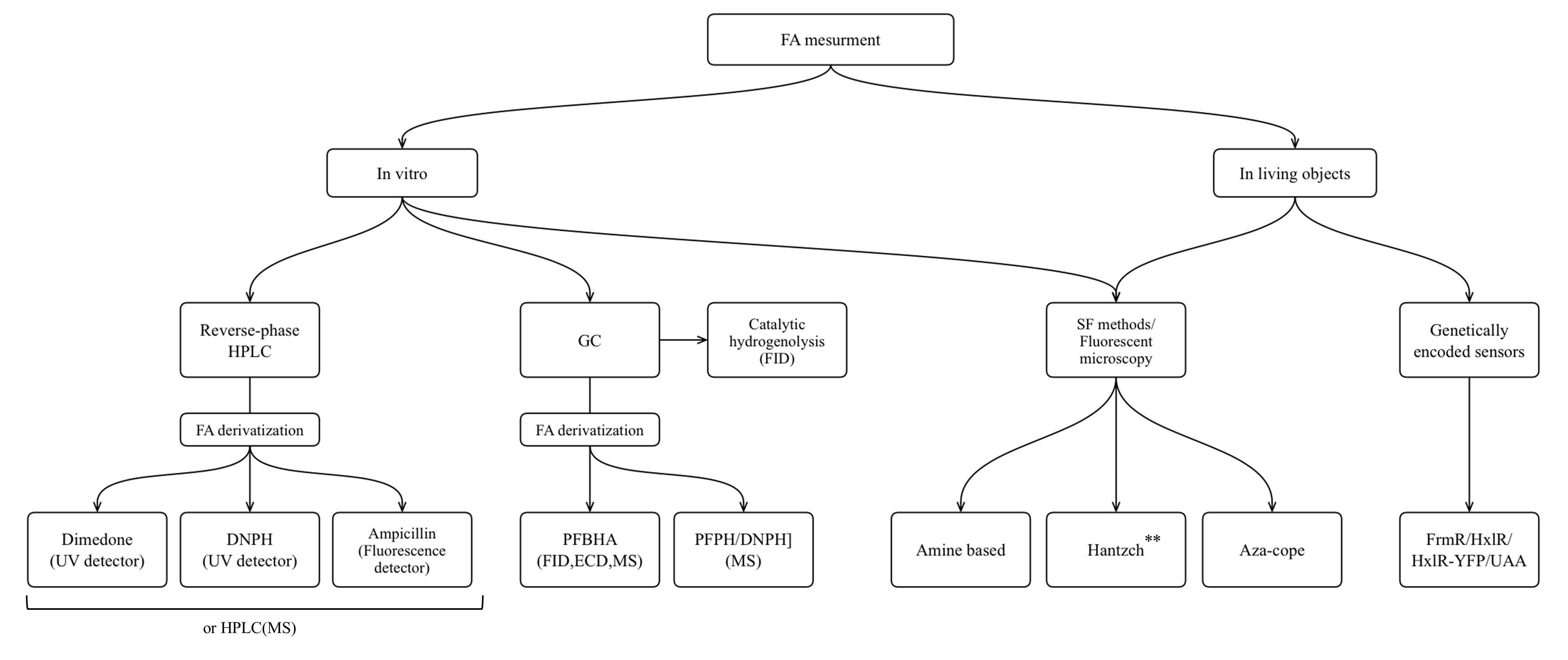 Figure 8. The approaches for FA measurement applicable for different biological samples: HPLC, high performance liquid chromatography; GC, gas chromatography; MS, mass spectrometry; FID, flame ionization detector; ECD, electron-capture detector; SF, spectrophotometry. **Only Hantzch polymers that do not show cytotoxicity could be used for living objects.