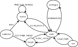 In our graph database schema, entities are represented as nodes, and relationships as directed edges. Two edges are used to represent many-to-many relationships. Customer, invoice, target, work, and worktype entities are represented as nodes. Relationships PAYS from the customer to invoice, and CUSTOMER_TARGET from the customer to the target, and PREVIOUS_INVOICE from an invoice to another are represented by directed edges, the last being a recursive relationship. WORK_TARGET, WORK_INVOICE, WORKHOURS and USED_ITEM are each represented by two edges. Below image represents the database structure in a graph format. The attributes of nodes and edges are not illustrated.