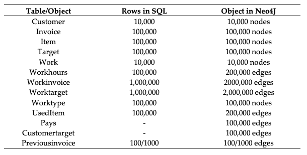 The test data follows the schemata of the databases given in previous figures. The used dataset was generated using the test program [15]. Table below shows the numbers of rows/objects generated for the dataset. For each row in the relationship tables of useditem, workhours, workinvoice and worktarget, two respective edges were generated for the Neo4j graph database, as a many-to-many relationship was expressed as a bidirectional relationship, i.e., two edges. The size of relational databases is 214 Mt and the size of Neo4J is 1,12 Gt.