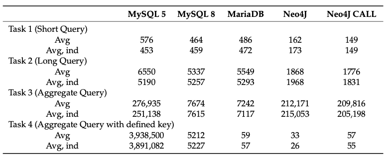8]. They used a schema with tables user, friends, fav_movies, and actors for testing, and they tested the databases with three queries: “Find all friends of Esha”, “Find all favourite movies of Esha’s friends” and “Find the lead actors of Esha’s friends’ favourite movies”. Queries were executed on 100 and 500 objects. Neo4j had 2–5 times faster query execution times with a 100-objects data set and 15–30 times faster query execution with a 500-objects data set. The work by Batra et al. [