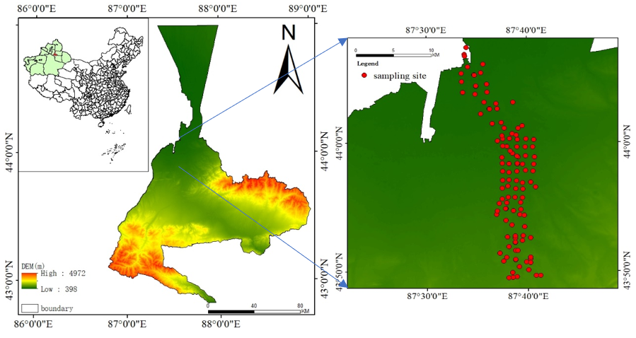 Urumqi is the capital of the Xinjiang Uyghur Autonomous Region. It is located on the northern slope of the Tianshan Mountains and is surrounded by desert. It is located between 42°45′32.4″–44°08′00″ N and 86°37'33.3″–88°58'24.4″ E. Urumqi is located in the centre of the Eurasian Continent, Northwest China, and central Xinjiang. It is the political, economic, cultural, and transportation centre of Xinjiang. It is the world’s largest city that is the farthest from the sea. It is the bridgehead of the Second Eurasian Continental Bridge in western China and an important gateway for China to open to the west. Urumqi is approximately 153 km long from north to south and 190 km wide from east to west, with a total area of 12,000 km2.