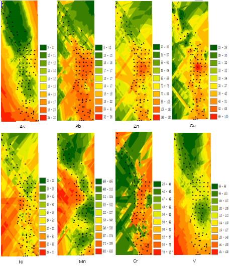 Only the surface soil was sampled completely among the three soil layers, and other soil layers could not be excavated entirely because of various factors; therefore, the sampling points were incomplete. As shown in Figure 3, we used the Kriging interpolation method to draw the distribution map of heavy metal concentration in the 0–20 cm soil layer and further analysed the heavy metal sources using this map. According to the correlation analysis, a significant correlation was observed between Zn, Pb, and Cu; moreover, the concentration distributions of As, Mn, and V had a significant correlations, as shown in Figure 2. According to the distribution law of heavy metal concentrations, the distribution of Zn, Pb, Cr, and Cu at the southern part of the river was significantly higher than that at the northern part; however, the concentrations of As, Mn, Ni, and V were lower at the sampling point and higher around the sampling point. Based on this, we inferred that Zn, Pb, Cr, and Cu were from one of the pollution sources that were concentrated in the southern part of the river, whereas Mn, Ni, and V were from another pollution source that were evenly distributed on both sides of the river and slightly away. The southern end of Shuimo River is in the centre of Urumqi, which is a densely populated area. Therefore, it can be determined that Source 1 is a anthropogenic source, primarily including pollutants emitted by motor vehicles and human domestic garbage. However, the concentration of Source 2 was low near the river and slightly better around the river. It was determined as a natural source and primarily included the heavy metal pollution due to the soil-forming parent material. The concentration of heavy metals around the river was low, which can be attributed to the role of water flow in transferring the heavy metals.
