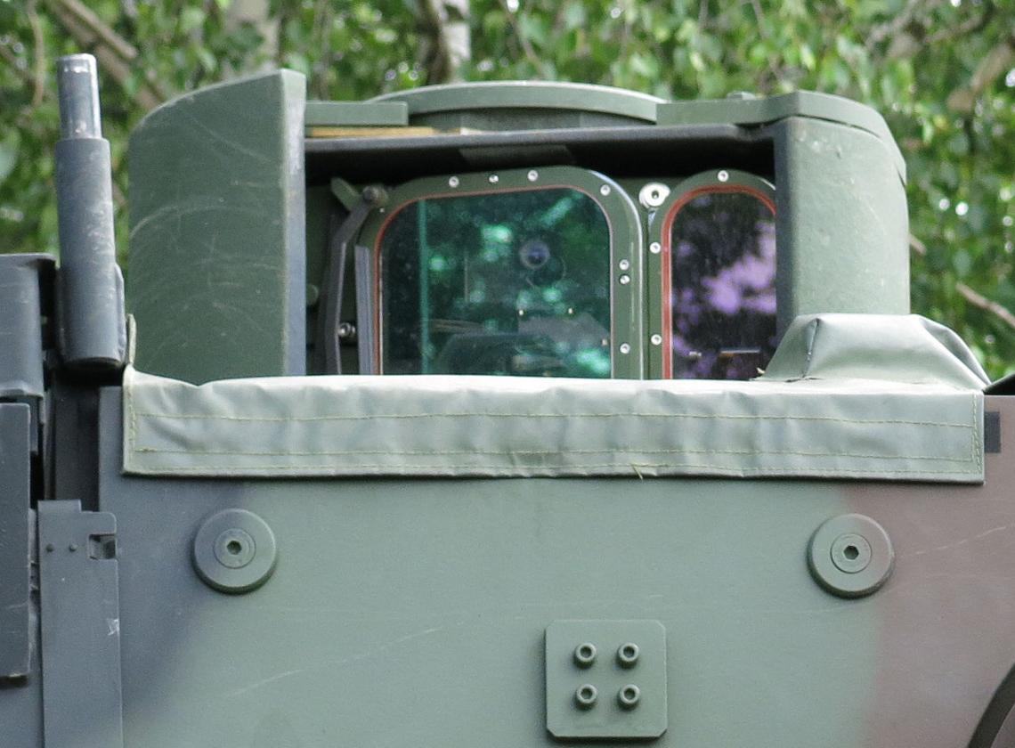 In addition to the usual smoke-grenade launchers with 8 shots, there is a 6-shot 76 mm launcher at the back of the vehicle for close-in defence. The main back door can be opened halfway and enables two of the passengers to scout and shoot from moderate protection.